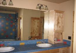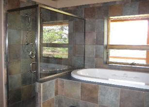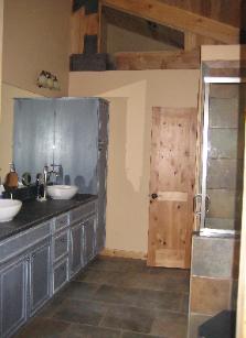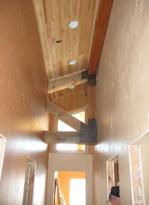 | Those big timber trusses can create beautiful accents within the house. Such as in the great room (above) the Master Bathroom (below) or the Hallway (right). |