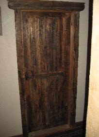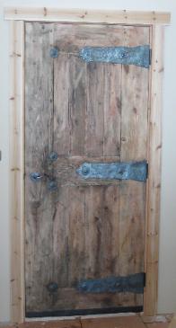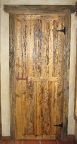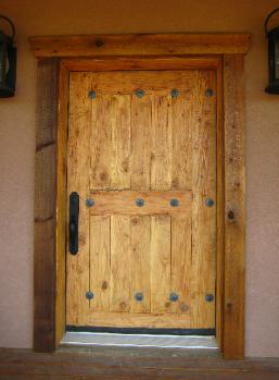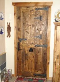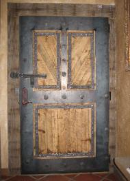 | Jim hand builds these doors using custom tongue and groove connections and ties everything together with hot rivets. These doors weigh a few hundred pounds, making for a solid and smooth entryway for your home. |